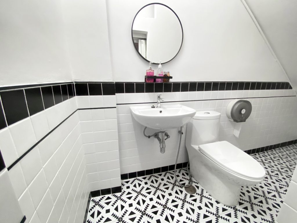 - ต่อมาก่อผนังห้องน้ำด้วยอิฐมอญ ฉาบปูนให้เรียบร้อยแล้วติดตั้งชักโครก โถปัสสาวะ อ่างล้างหน้า และตะแกรงระบายน้ำทิ้ง ในส่วนของผนังก็ปูด้วยกระเบื้องสีขาวสลับลายสีเทา ในส่วนของชักโครกนั้นจะลงแซทโดยแยกส่วนออกจากตัวบ้าน ซึ่งต้องลงเสาเข็มด้วยเช่นกัน
