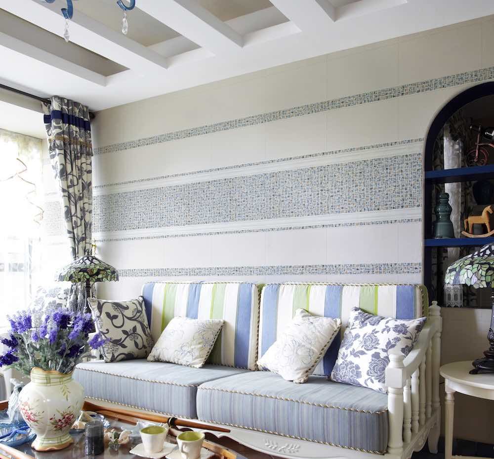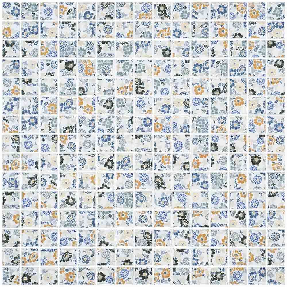 ลวดลายดอกไม้หลากสีสัน แทรกอยู่ในเม็ดโมเสคขนาดเล็ก 6 หุน ใช้สำหรับตกแต่งพื้นหรือผนังเพื่อเพิ่มความโดดเด่น