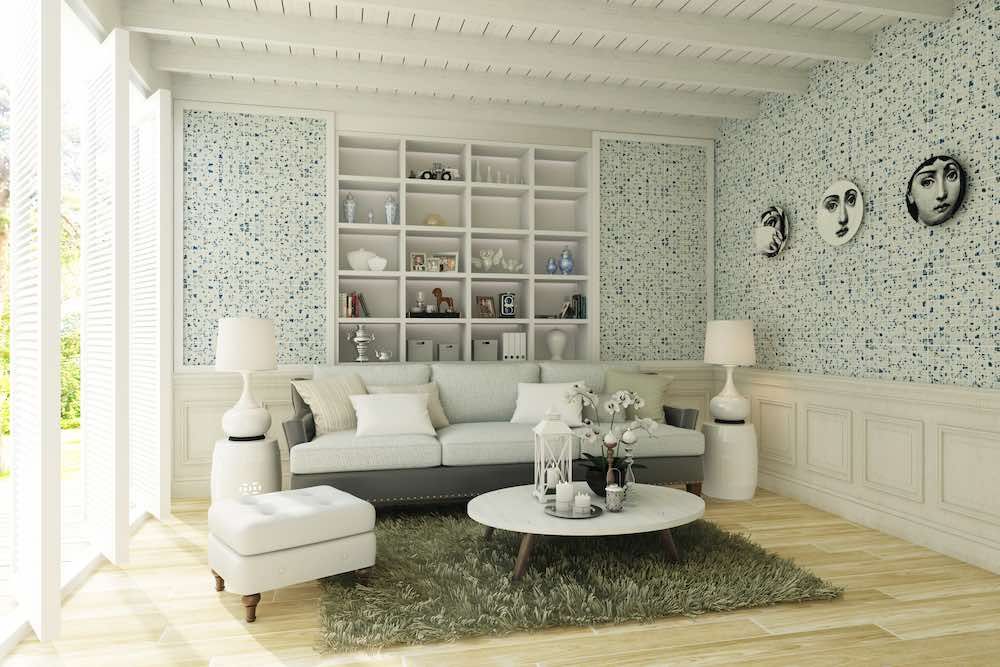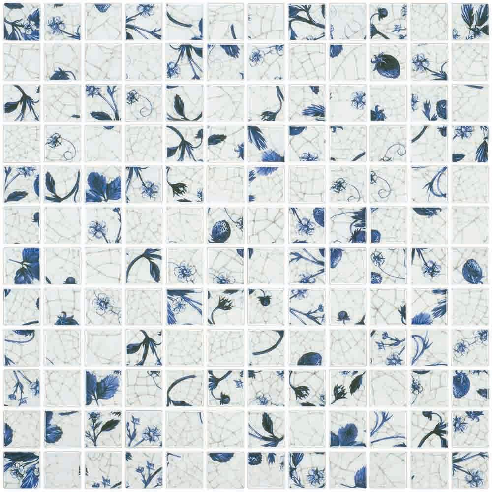 โมเสคตกแต่งลวดลาดของเถาต้นสตรอเบอร์รี่ นำมาปรับเป็นโทนสีฟ้าอมขาว ที่ให้อารมณ์แนว English Country หน้ามัน ทำความสะอาดง่าย เหมาะกับการใช้งานทั้งพื้นและผนัง